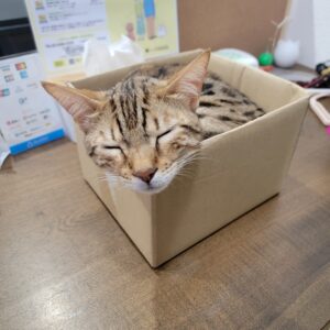最後は諦めて段ボールベッドを置いたらお気に入りの場所になってましたね