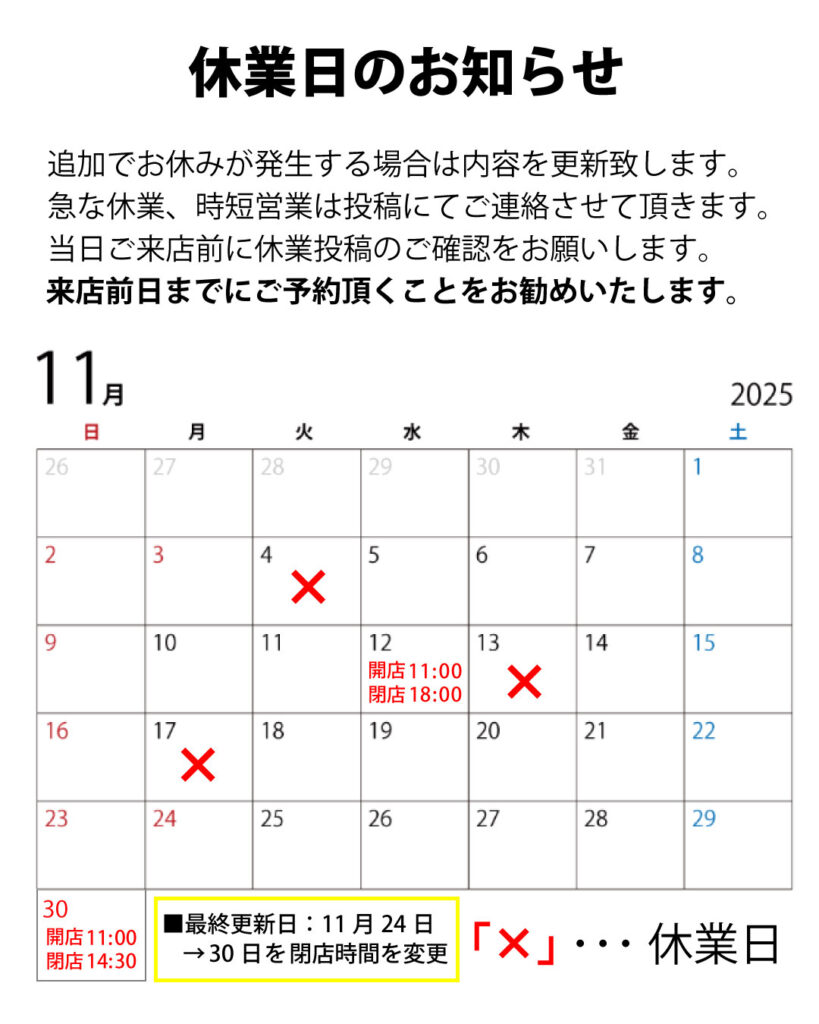 店休日の最新情報はインスタにてご確認をお願いします。