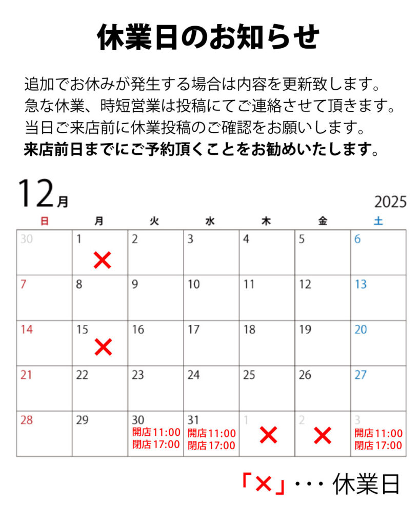 31日(日)時短営業(開店 11:00 最終受付 16:30 閉店 17:00)